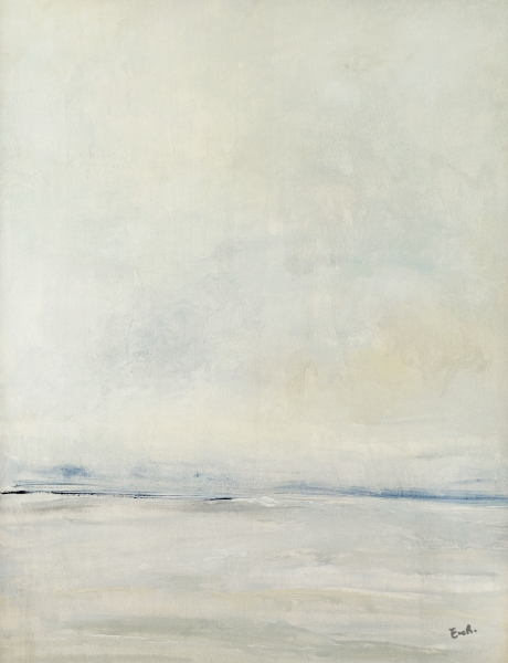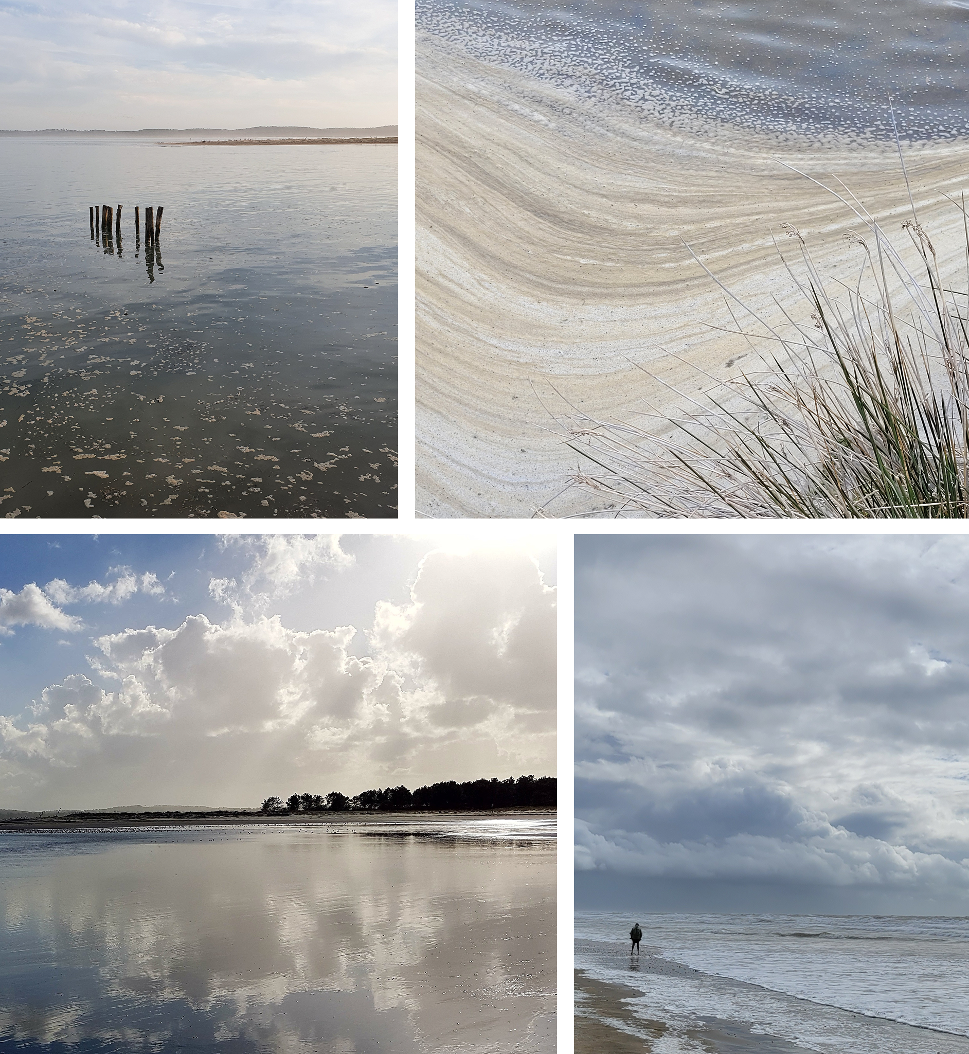 Elle peint des atmosphères sensibles où lumière, reflets des vagues, jeux de nuages et nuances gris-bleu-vert se mêlent pour saisir l’émotion de l’instant.
