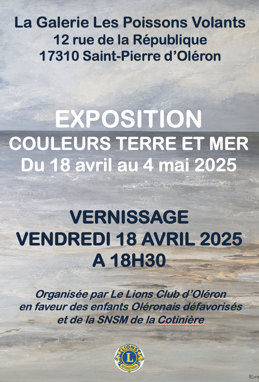 L’exposition « Couleurs terre et mer », présentée à la Galerie des Poissons Volants à Saint-Pierre d’Oléron, et organisée par le Lions Club, a mis en lumière les œuvres de l’artiste dans un ensemble riche en techniques et en textures. L’entrée était libre et un vernissage convivial s’est tenu le 18 avril. Les bénéfices de l’événement ont été reversés pour partie à la SNSM de la Cotinière et ont également permis de financer un séjour en centre de vacances pour des enfants oléronais.