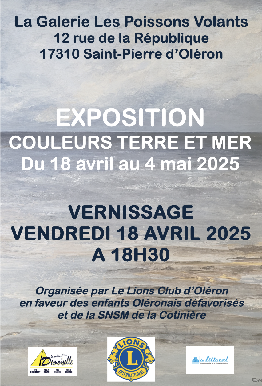 L’exposition « Couleurs terre et mer », présentée à la Galerie des Poissons Volants à Saint-Pierre d’Oléron, et organisée par le Lions Club, a mis en lumière les œuvres de l’artiste dans un ensemble riche en techniques et en textures. L’entrée était libre et un vernissage convivial s’est tenu le 18 avril. Les bénéfices de l’événement ont été reversés pour partie à la SNSM de la Cotinière et ont également permis de financer un séjour en centre de vacances pour des enfants oléronais.